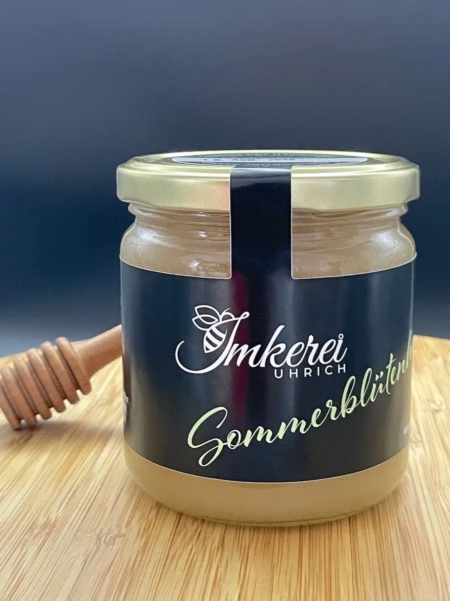 Im Sommerblütenhonig fehlen die Honigtauanteile und lassen den Honig schneller kristallisieren. Inhalte von diesem feincremigen Honig stammen von nicht bewirtschafteten Wiesen am Rande eines Waldes.